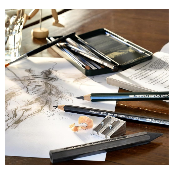 Estuche de grafito Faber Castel-PITT. Lápices y crayones de grafito con accesorios: la colección ideal para bocetos de calidad artística. Este paquete contiene siete lápices de grafito Castell 9000 (2H, HB, B, 2B, 4B, 6B y 8B), tres lápices de grafito Castell 9000 Jumbo (2B, 4B y 8B), tres lápices de grafito solubles en agua Graphite Aquarelle (2B, 4B y 8B), tres lápices Pitt Graphite Pure (3B, 6B y 9B), tres crayones Pitt Graphite (2B, 6B y 9B), un lápiz borrador Perfection, una goma de borrar de plástico, una goma de borrar artística moldeable, un sacapuntas doble, un bloque de lija, un pincel y un difumino en un estuche de 18 x 31 x 19 cm. Cumple con la norma ASTM D-4236. Importado.